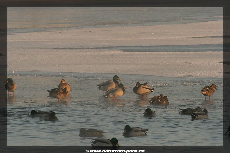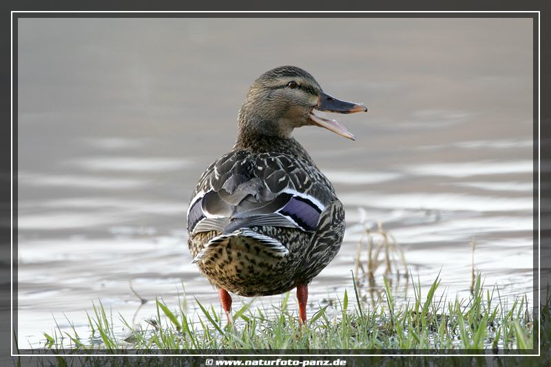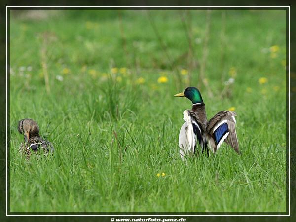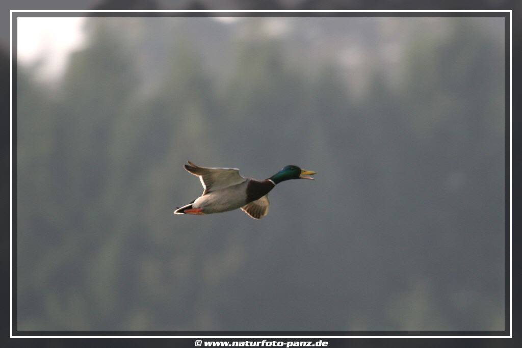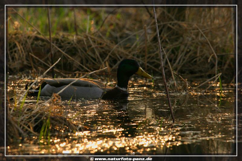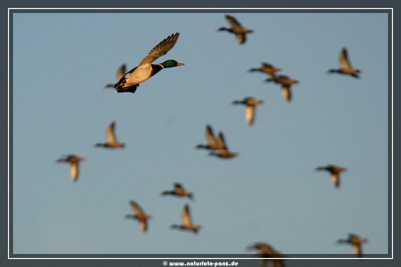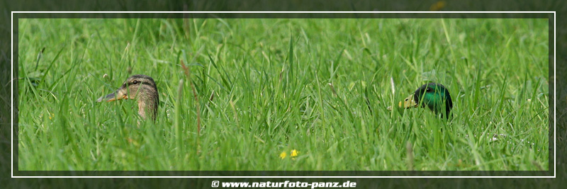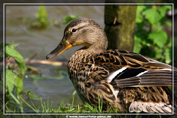 Häufigste Schwimmente. Prachtkleid des Männchens charakteristisch mit grünschillerndem Kopf und Hals, gelbem Schnabel, weißem Halsring, schokoladenbrauner Brust und metallisch blauem Flügelspiegel. Im Schlichtkleid außer dem grünlichgelben Schnabel weibchenfarben : gelblichbraunes Gefieder mit dunkelbraunen Flecken, Flügelspiegel gleich.