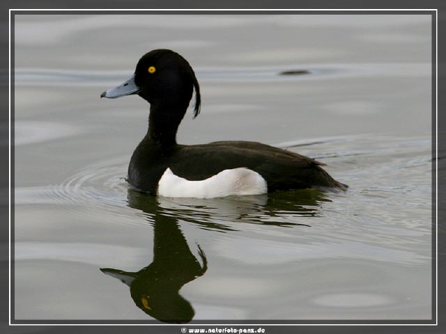 Männchen im Prachtkleid schwarz mit weißen Flanken und weißem Bauch ; purpurn schimmernder schwarzer Kopf mit langem, schwarzen Nackenschopf.