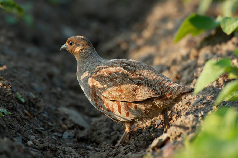 Gesicht und Schwanz rostrot, Brust grau mit dunkel rotbraunem, hufeisenförmigem Fleck, der bei der Henne nicht so deutlich ist, Beine grau. Die Flankenbänderung ist schwächer als beim Rothuhn und beim Felsenhuhn.